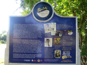 Located in Greenwood, Mississippi, the Blues Trail marker honoring the Blues Deejays stands as a testament to the pivotal role played by radio personalities in amplifying the vibrant sounds of blues music. Positioned amidst the city’s historical landscape, this marker pays homage to the influential deejays who served as musical missionaries, spreading the soulful rhythms of the blues far and wide. These deejays, such as “Daddy” Stovepipe (pictured), Sonny Boy Williamson II, and others, became the gatekeepers of the blues, using the airwaves to introduce audiences across the nation to the raw emotion and storytelling embedded in this musical genre. Their broadcasts not only entertained but also catalyzed the spread of blues culture, shaping the trajectory of American music. The marker is a reminder of their invaluable contribution, immortalizing their legacy within the colorful tapestry of Greenwood’s blues history.